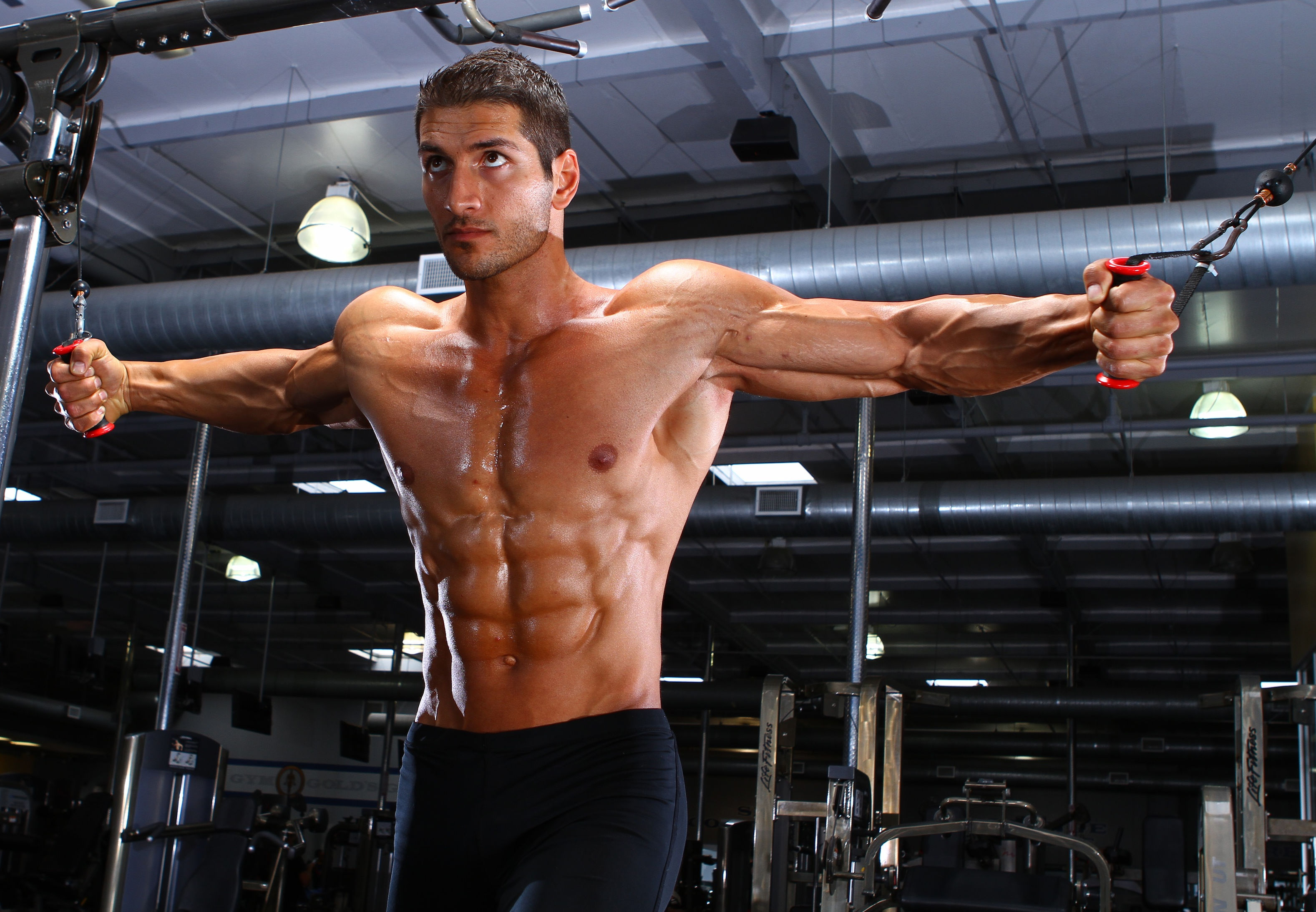 He pulled off his jacket and shirt and put on his workout muscle-T. "My body must please the master," Gabe mumbled as he headed into the near-empty gym.