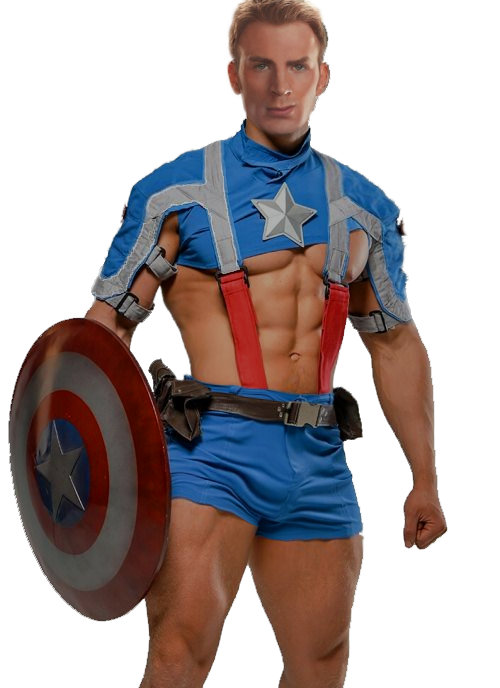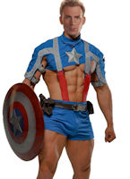 Another man appeared from behind the throne. This one Thor recognized. It was his fellow Avenger Steve Rogers, known as Captain America. He was wearing a version of his normal costume. However, the top was mesh, allowing much of his prodigious physique to be displayed. Instead of pants, he had on bright turquoise shorts that barely went past the crotch.