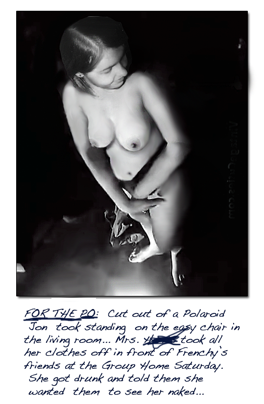 Frenchy would eventually confide what he wanted her to do, like it was some private guilty craving, something he of which he was ashamed but which he longed for and begged her to satisfy. In this way he was making an intentional mockery of my own perverse sexual ideas of her humiliation, that same ones that had brought her to this end; but she did not see the irony in it. She loved him and wanted to make him happy---just as she had for me. So she did not see the joke that he was playing on her and me, coaxing her to degrade herself for his voyeuristic sexual pleasure, just as I had done, coaxing my wife to present herself naked before this horny teenaged boy, who now shall plead her to do the same thing for him. She was just flushed with romantic feelings (and private sexual feelings), and she would do anything for him that he wanted; although, to tell the truth, I think that in her heart (and in her sexual self) she knew full well the humiliation she was about to submit to and she really wanted it; it aroused her, even the shame of it.