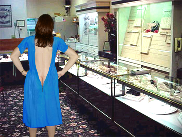 He drew his hand out and stepped out to the front of the counter and looked at her face. He had not zipped up her dress. She did not know if she should do it or not. She waited for him to say something. He simply stared at her.